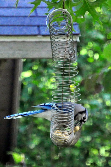 Blue jays have to be the hardest bird...well maybe right up there with the hummers...to photograph. They sure are skittish. I have been trying to sit out near the feeders so they will get use to seeing me. They fly in, grab, and go. All in about three seconds. Today I tried to get him in the act...not great but it is a start.