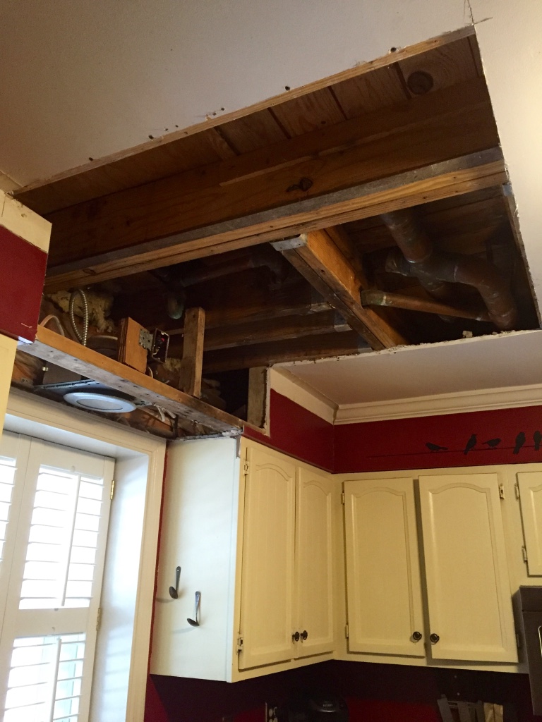 All demo complete. Problem located. Plan of attack made. Now waiting on the plumber to return on Thursday to do his thing. Then the carpenter returns to cover up the hole. And lastly the painter shows up. I am praying he can match my barn red paint. Last painted when we moved in ten years ago. Might be a challenge to match the paint.