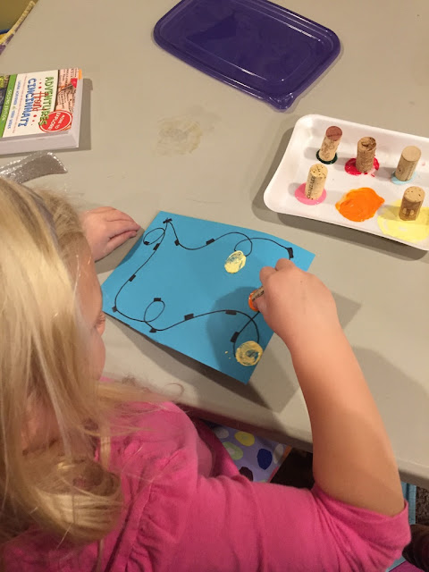Art project this week was using wine corks (provided by Grammy). We made strings of Christmas lights.