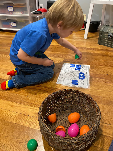 Saw a new fun game that I can use anytime but I adapted it to Easter eggs. We found eggs with upper case letters.