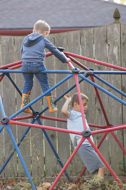 Since Gabe has learned to climb to the top of the climber Jase is teaching him new tricks.
