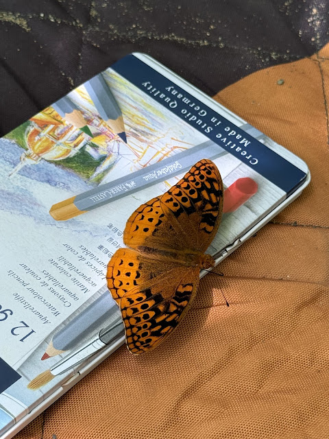 Jeremy gets to flyfish.  Amanda strains to listen to the birds over the roar of the waterfall.  Jase wet his feet and contemplated how he was going to climb to the top of the falls.  Pappy parks his chair on the trail and makes new friends, and Adi and I try our hand at watercolor.